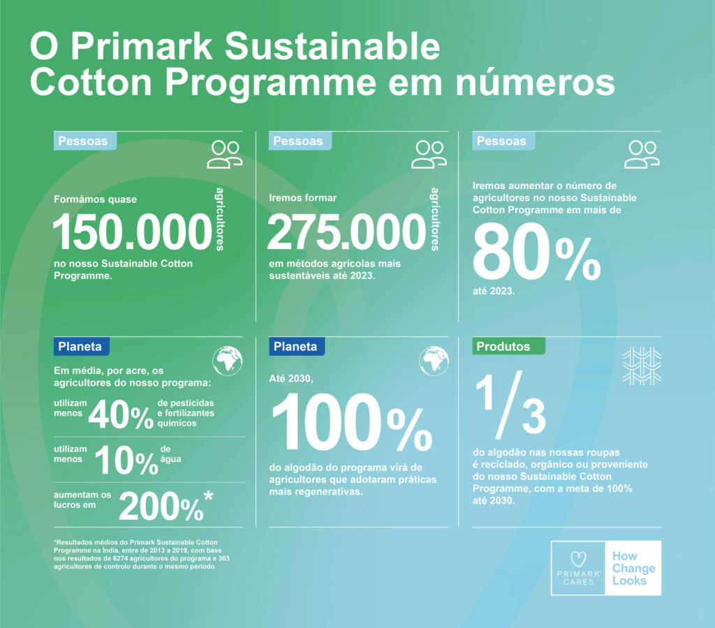 A Primark vai formar mais 125 mil pequenos agricultores de algodão através de métodos mais sustentáveis na Índia, Paquistão e Bangladesh, até ao final de 2023, no âmbito do seu programa de algodão sustentável. Outro dos objetivos é aumentar em 60% a produção de algodão sustentável para os produtos Primark.