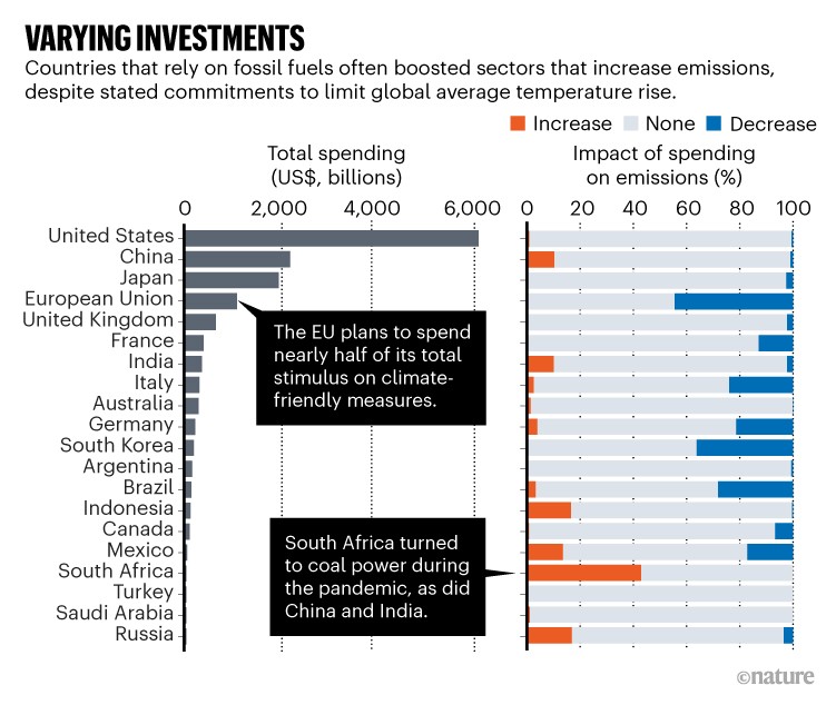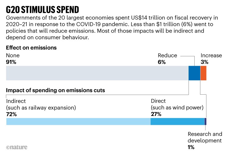 Durante os últimos dois anos, os países que compõem o grupo do G20 gastaram pelo menos 14 biliões de dólares – perto do PIB anual da China – em estímulos económicos. No entanto, segundo uma análise publicada na revista científica Nature, apenas 6% (ou cerca de 860 mil milhões) foram investidos para a descarbonização. O relatório nota ainda que quase 3% do total dos estímulos foi investido em atividades que deverão aumentar as emissões de carbono globais.