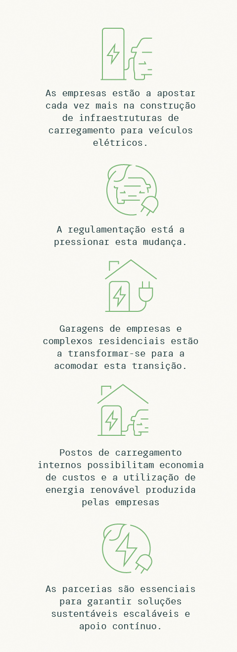 O crescente interesse das empresas na implantação de redes de carregamento elétrico não reflete, porém, apenas uma mudança de direção rumo a veículos mais sustentáveis, mas desencadeia também uma série de transformações na infraestrutura. As garagens de muitas empresas estão a transformar-se, mas também a aposta residencial é já pensada de raiz para acomodar os elementos necessários para responder à crescente procura de pontos de carregamento.