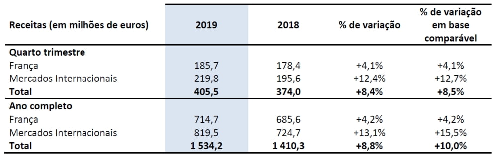 Já as receitas internacionais continuaram a crescer a um ritmo muito acelerado de 12,4% e de 12,7% numa base comparável, totalizando 219,8 milhões de euros. As taxas de câmbio constantes tiveram um efeito geral favorável ao longo do trimestre, enquanto o efeito das aquisições e desinvestimentos na estrutura do grupo incluem o fim de operações na África do Sul, em setembro de 2019, e a consolidação das atividades da Jagged Peak, nos Estados Unidos, em dezembro de 2019.