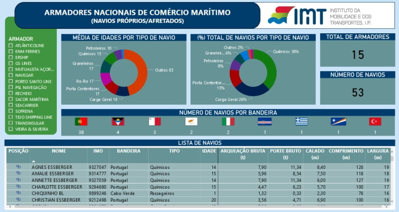 Esta nova ferramenta permite ter uma visão do shipping português, facilitando o conhecimento dos armadores nacionais de comércio marítimo, existindo, acordo com o IMT, 15 armadores com um total de 53 navios.