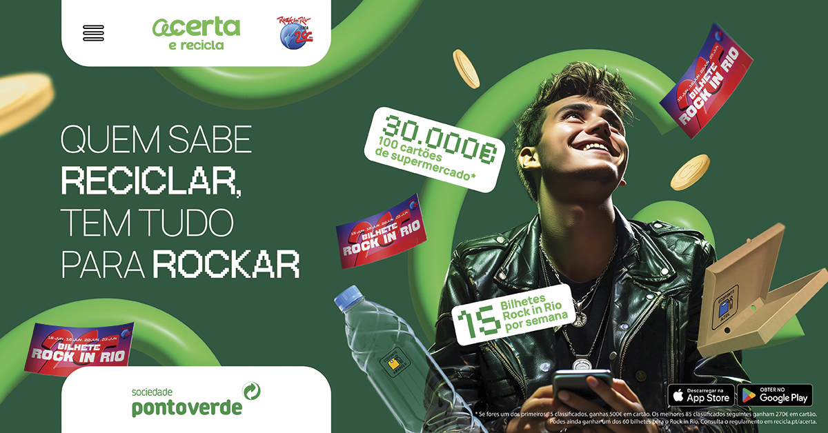 A mais recente campanha da aplicação da Sociedade Ponto Verde tem sido dedicada à edição deste ano do Rock in Rio Lisboa. Numa fase inicial, a participação nos jogos da app, e consequente acumulação de pontos, premiou os utilizadores com bilhetes para o festival de música que tem na sustentabilidade uma bandeira. No total foram oferecidos 60 bilhetes para entrar e viver a experiência da Cidade do Rock, aos quais se juntaram ainda a oferta de 100 vales de supermercado que perfizeram um total de 30 mil euros.