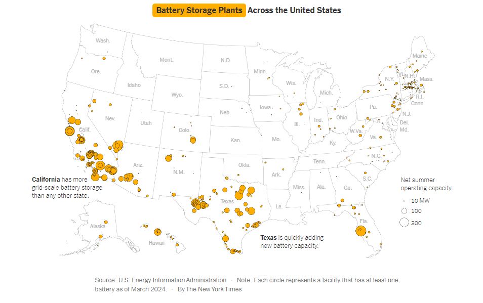 Atualmente, as baterias gigantes fornecem, no máximo, 4% da eletricidade do Texas, o suficiente para abastecer um milhão de casas, indica o artigo do The New York Times.