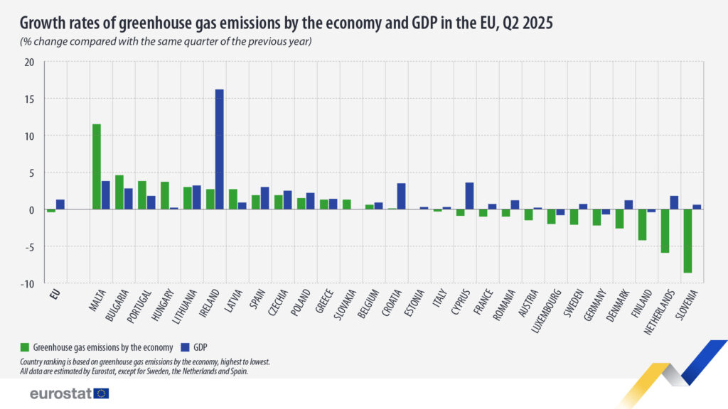 No segundo trimestre de 2025, estimaram-se aumentos homólogos das emissões de GEE em 14 países da UE, reduções em 12, enquanto a Estónia manteve valores estáveis.