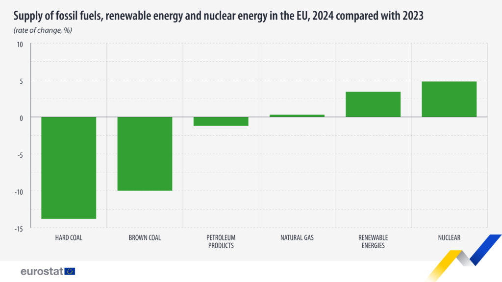 A análise também concluiu que a produção de eletricidade a partir de combustíveis fósseis registou uma queda de 7,2% face ao ano anterior, totalizando 0,81 milhões de GWh e representando 29,2% da produção elétrica total da UE em 2024.