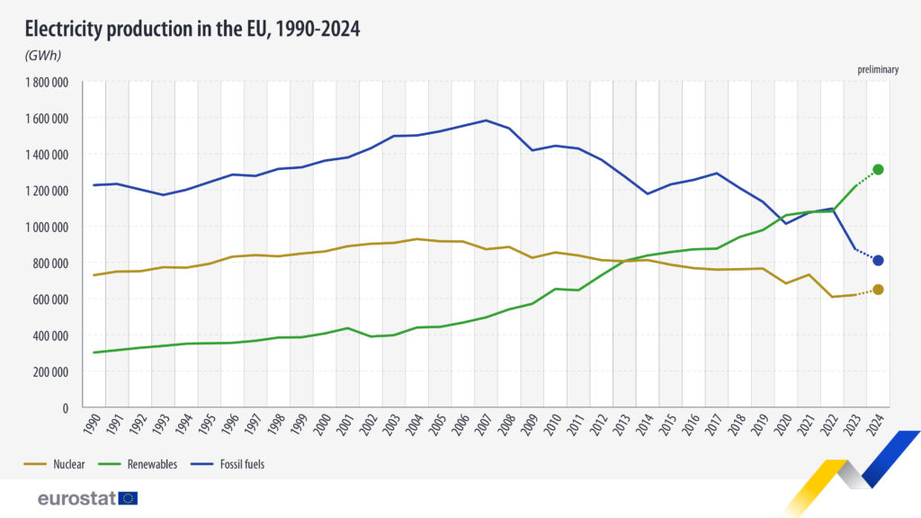 Segundo dados preliminares do Eurostat, as energias renováveis geraram 1,31 milhão de gigawatts-hora (GWh), um aumento de 7,7% em comparação com 2023.