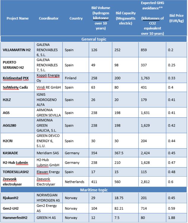 Dos 15 projetos selecionados, 12 vão receber apoios fixos entre 0,20€ e 0,60€ por quilograma de hidrogénio produzido. De acordo com a nota de imprensa, pela primeira vez, o leilão incluiu um orçamento dedicado ao setor marítimo, o que resultou na seleção de três projetos, na Noruega, com um financiamento total de 96,7 milhões de euros. Estes projetos vão exigir um apoio que varia entre 0,45€ e 1,88€ por quilograma.