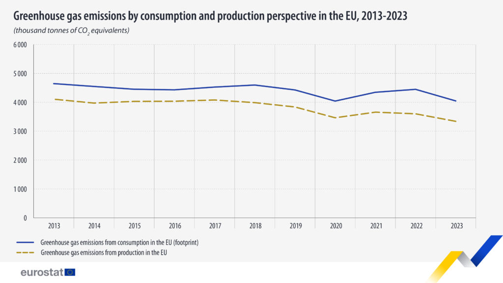 Em 2023, a pegada de carbono associada a todos os bens e serviços consumidos na UE atingiu 4 mil milhões de toneladas de CO₂ equivalente. No mesmo ano, as emissões geradas pela produção dentro da UE totalizaram 3,3 mil milhões de toneladas.