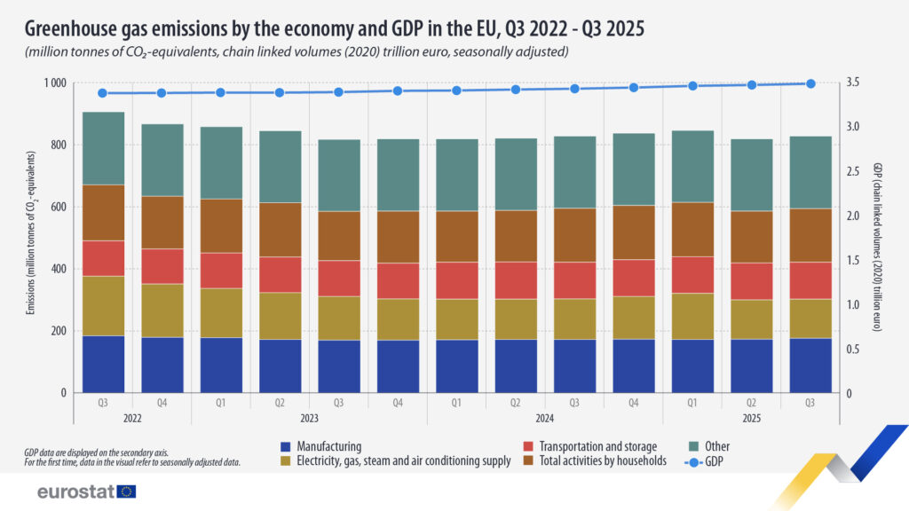 As emissões de gases de efeito estufa (GEE) da economia da União Europeia (UE) registaram um aumento de 1,1% no terceiro trimestre de 2025, totalizando 828 milhões de toneladas de CO2 equivalente (CO2-eq), em comparação com os 819 milhões de toneladas de CO2-eq do trimestre anterior.