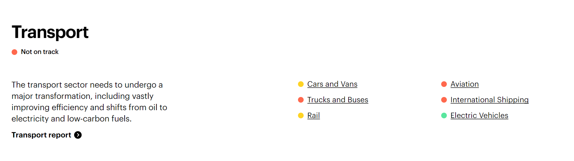 Apesar da boa posição dos veículos elétricos, o setor dos transportes “precisa de enfrentar uma grande transformação, incluindo melhorar vastamente a eficiência e as mudanças de petróleo para a eletricidade e combustíveis de baixo carbono”, nota o relatório. As componentes são analisadas através do método semáforo, com o verde a indicar que esta está em linha com a neutralidade, o amarelo a indicar que a tendência é positiva e o vermelho a indicar que as tendências são negativas ou substancialmente insuficientes. Os transportes no geral estão no vermelho, acompanhados (em específico), pelos camiões e autocarros, aviação e transporte internacional. A ferrovia e os carros e as carrinhas estão no patamar amarelo.